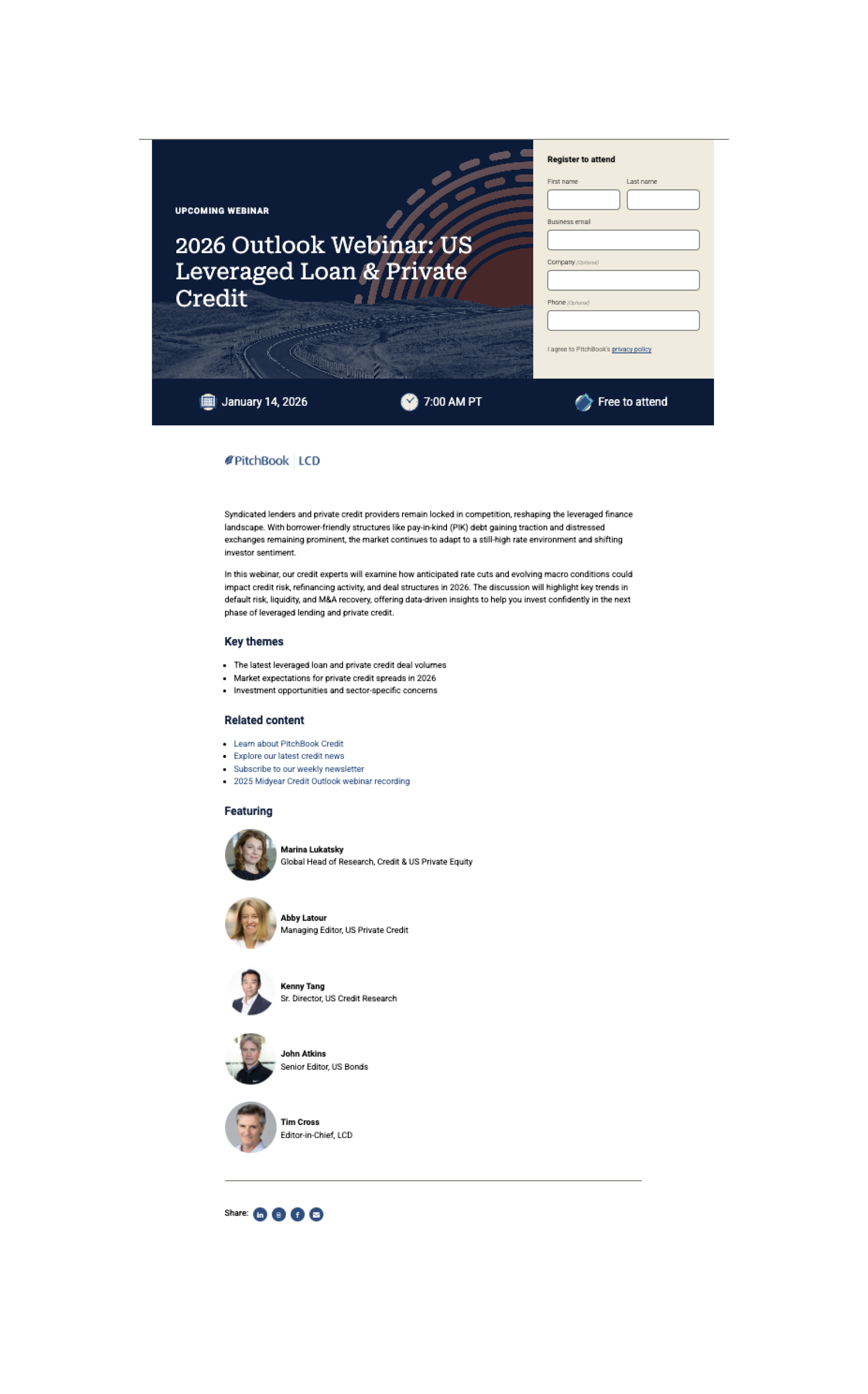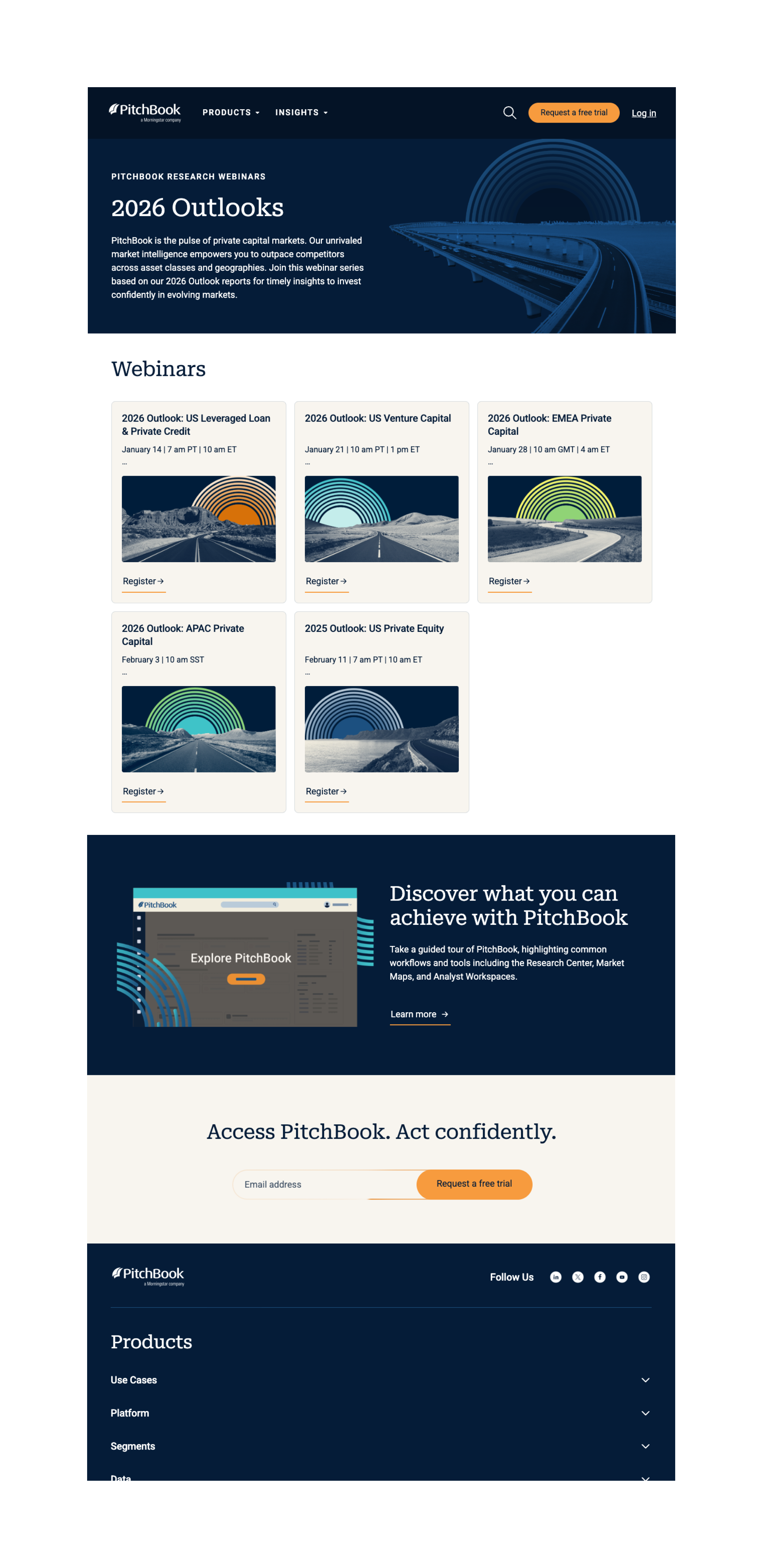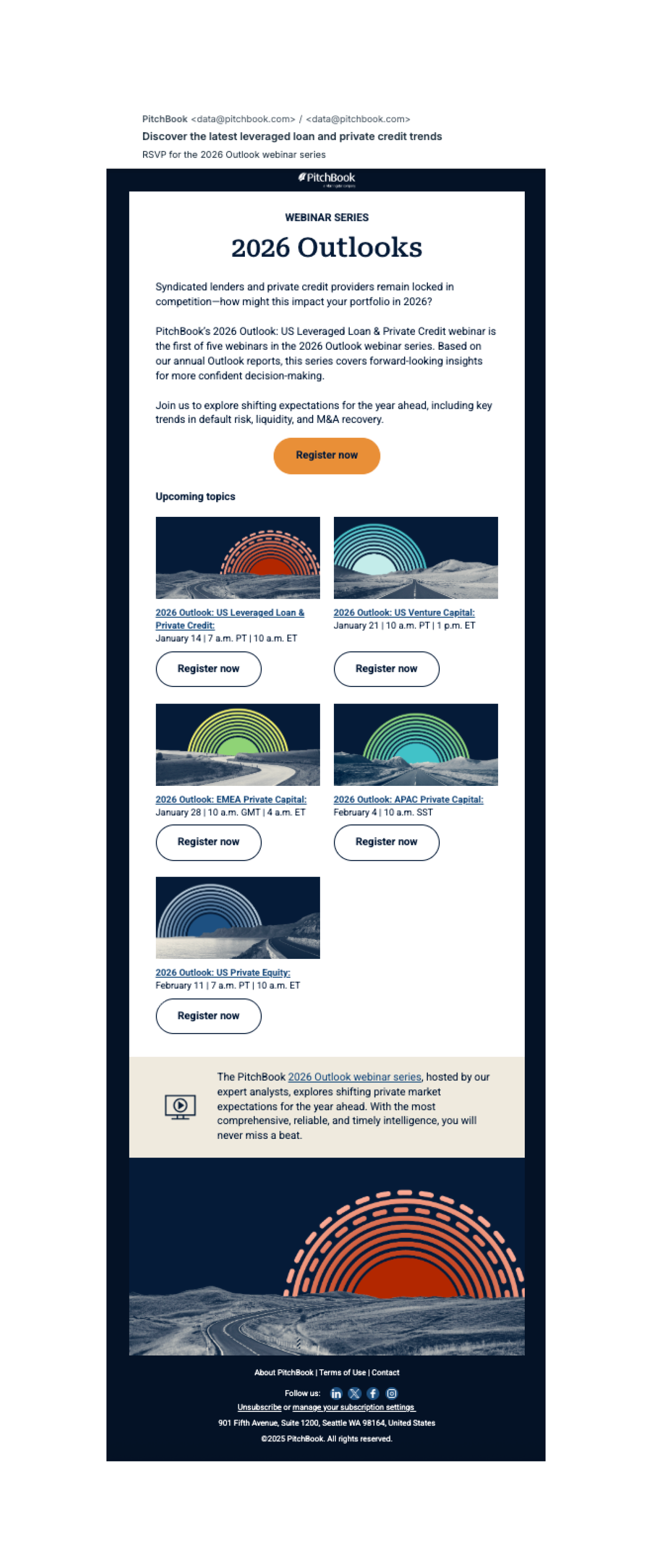 The Outlook campaign was a digital first initiative designed to highlight PitchBook Outlooks, a global series of research reports focused on evolving markets. The campaign supported multiple regional and sector specific Outlooks across US PE, US VC, US Credit, APAC, and EMEA. It included a multi webinar program with five live sessions, each supported by a full ecosystem of assets to drive awareness, registration, and ongoing engagement. Deliverables spanned promotional emails, webinar hub pages, registration and on demand pages, invite and repromo emails, organic social assets, side pops, thank you emails, and supporting reports to deepen understanding of the Outlooks. Additional digital advertising executions included Reddit promotions and broader awareness assets. The system was built to scale across regions while maintaining a cohesive visual and messaging framework throughout the campaign.Creative Team
