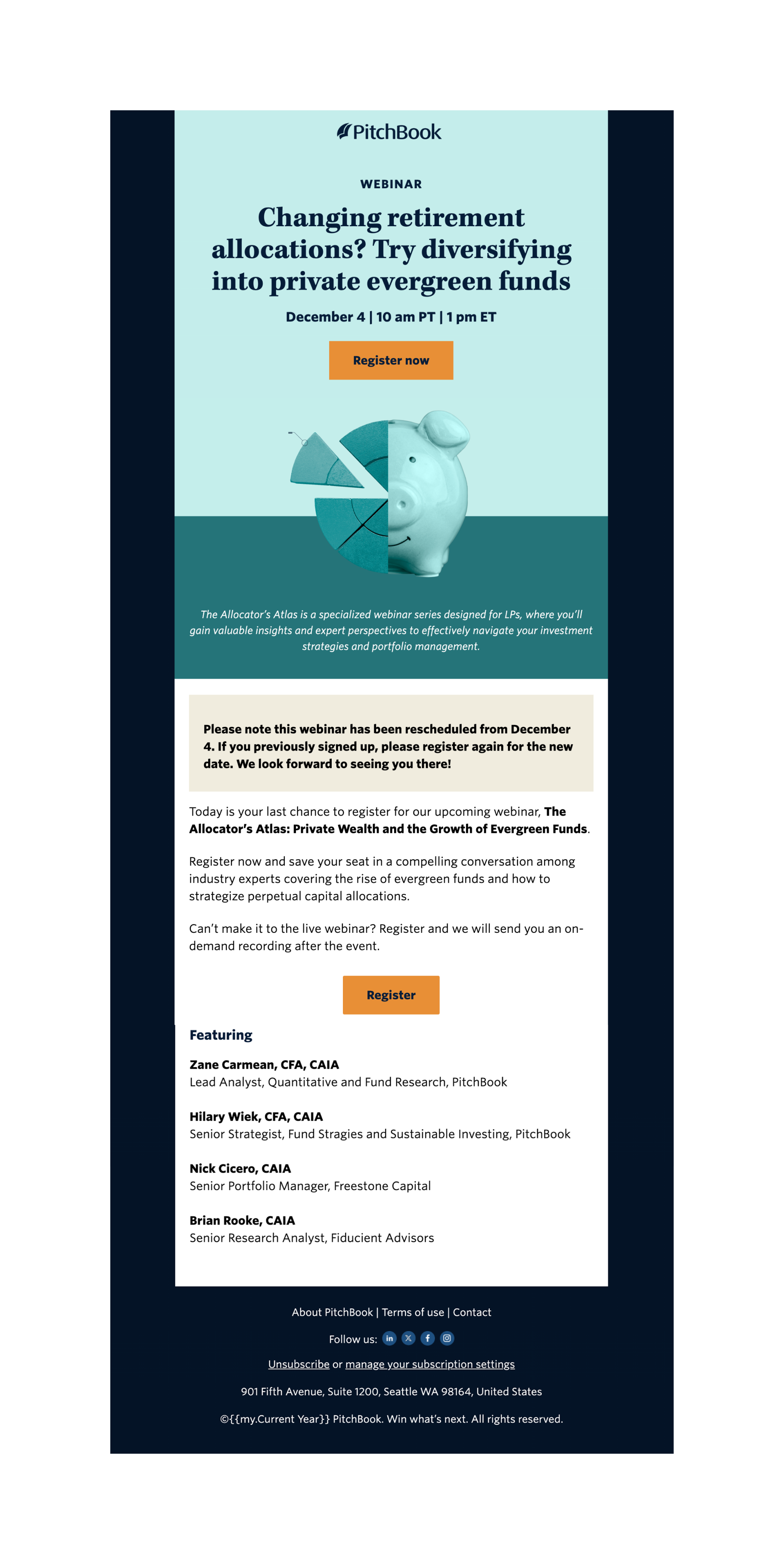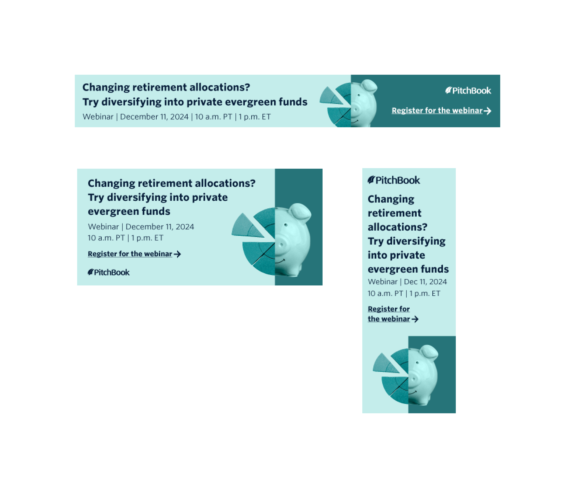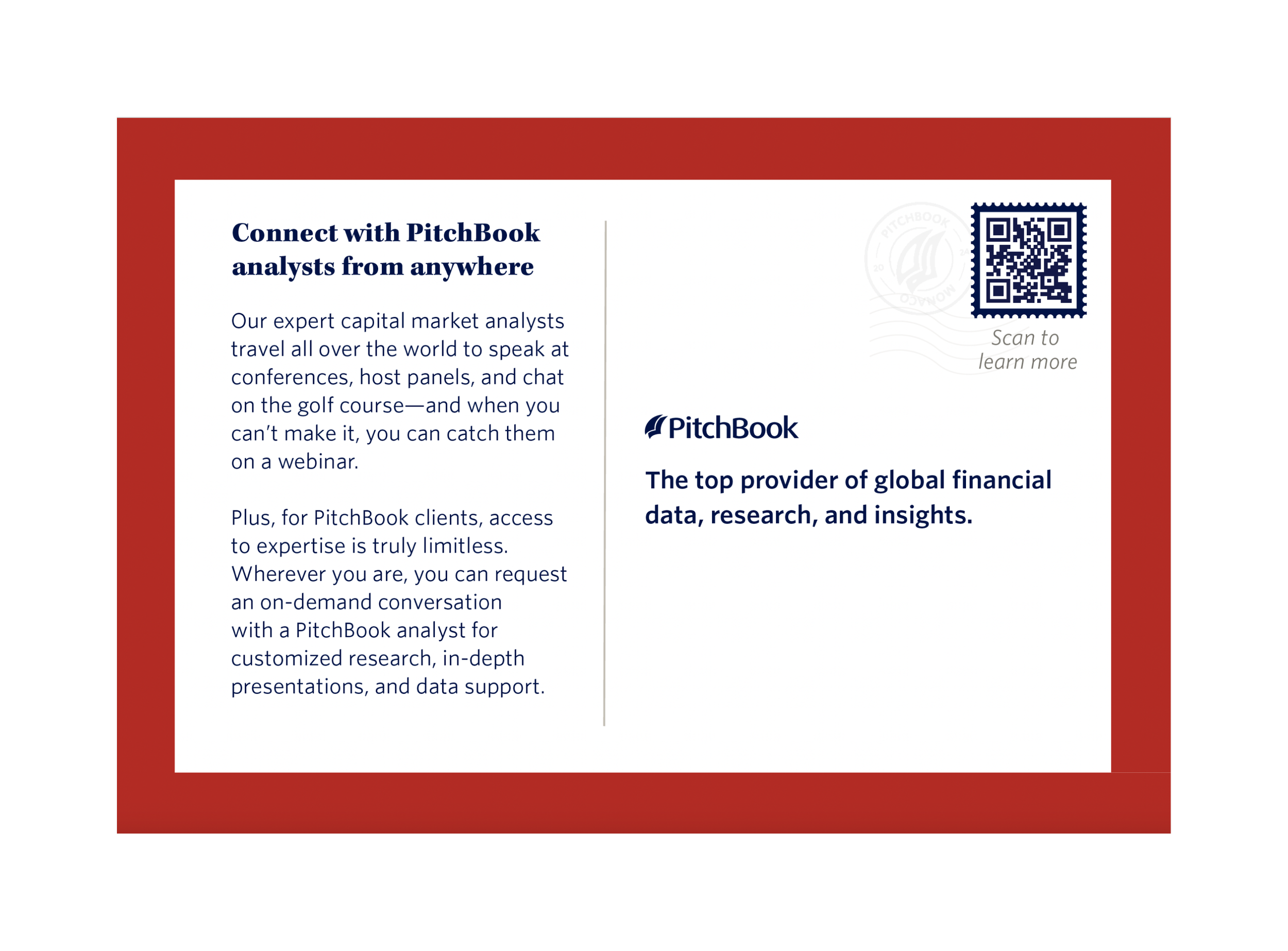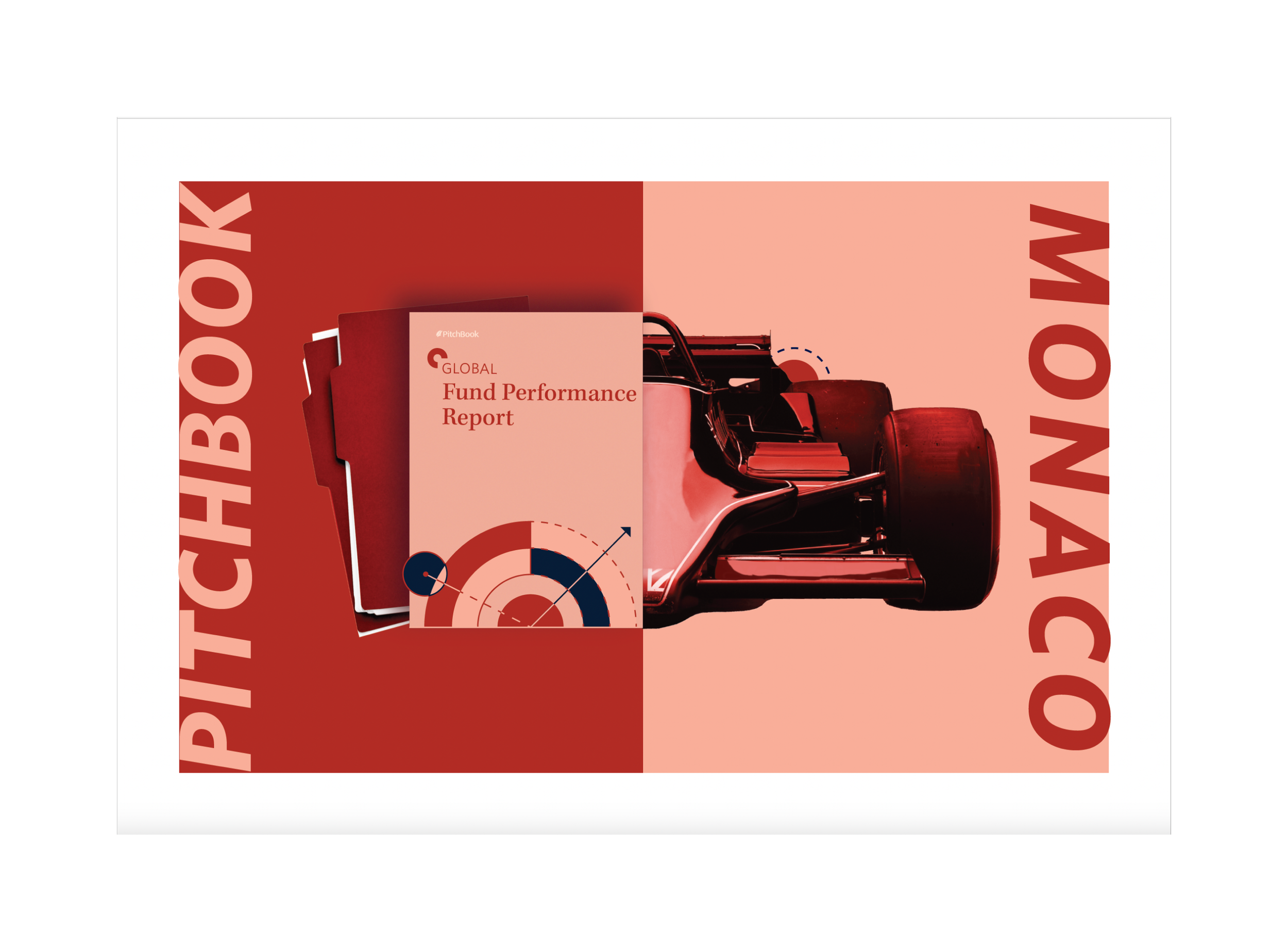 Fall Wave was a digital first campaign developed from the creative team to showcase the breadth of PitchBook research through a theme called This/That. The concept used paired composites to clearly contrast and connect two areas of coverage such as sectors and industries, reports and segments, or use cases. The visual system made complex research offerings feel approachable and easy to scan while reinforcing the idea of unpacking everything available within PitchBook. Messaging centered on discovery and exploration, supported by flexible calls to action including Explore Now, Register, Request Access, and Download Report. The campaign ran for an entire quarter and extended across emails, paid and organic social, web placements, digital ads, webinars, enablement materials, promo videos, and event collateral. Notable executions included printed postcards and business cards for an F1 Monaco event, demonstrating how the system translated from digital to physical touchpoints.